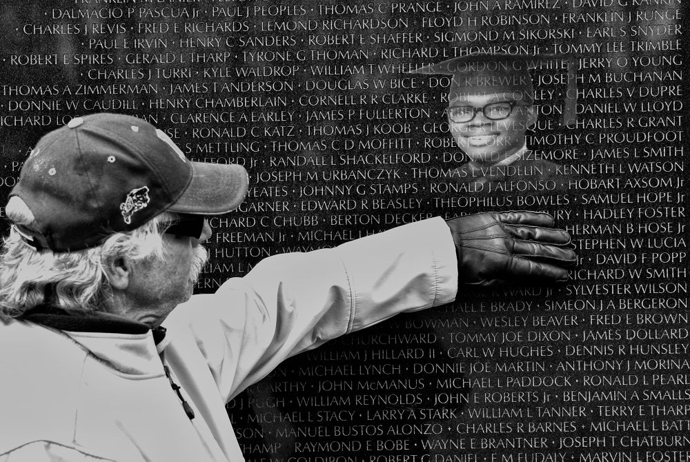 Army veteran Leonard Cowles gazes upon the past with a scene from his time overseas cast into the Vietnam Veterans Memorial.